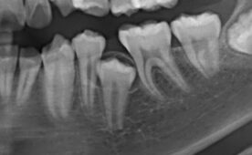 60代男性、6番欠損の状態が長期だったため7番が近心に倒れ込み8…