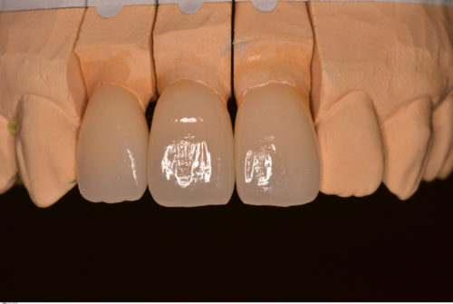 写真は20年前に入れた前歯3本の歯茎の際に、歯根が見えるのが気になるということで来院された患者さんです。